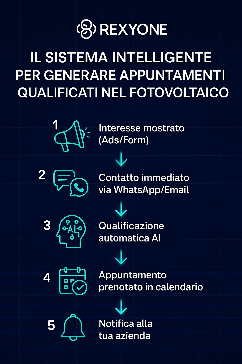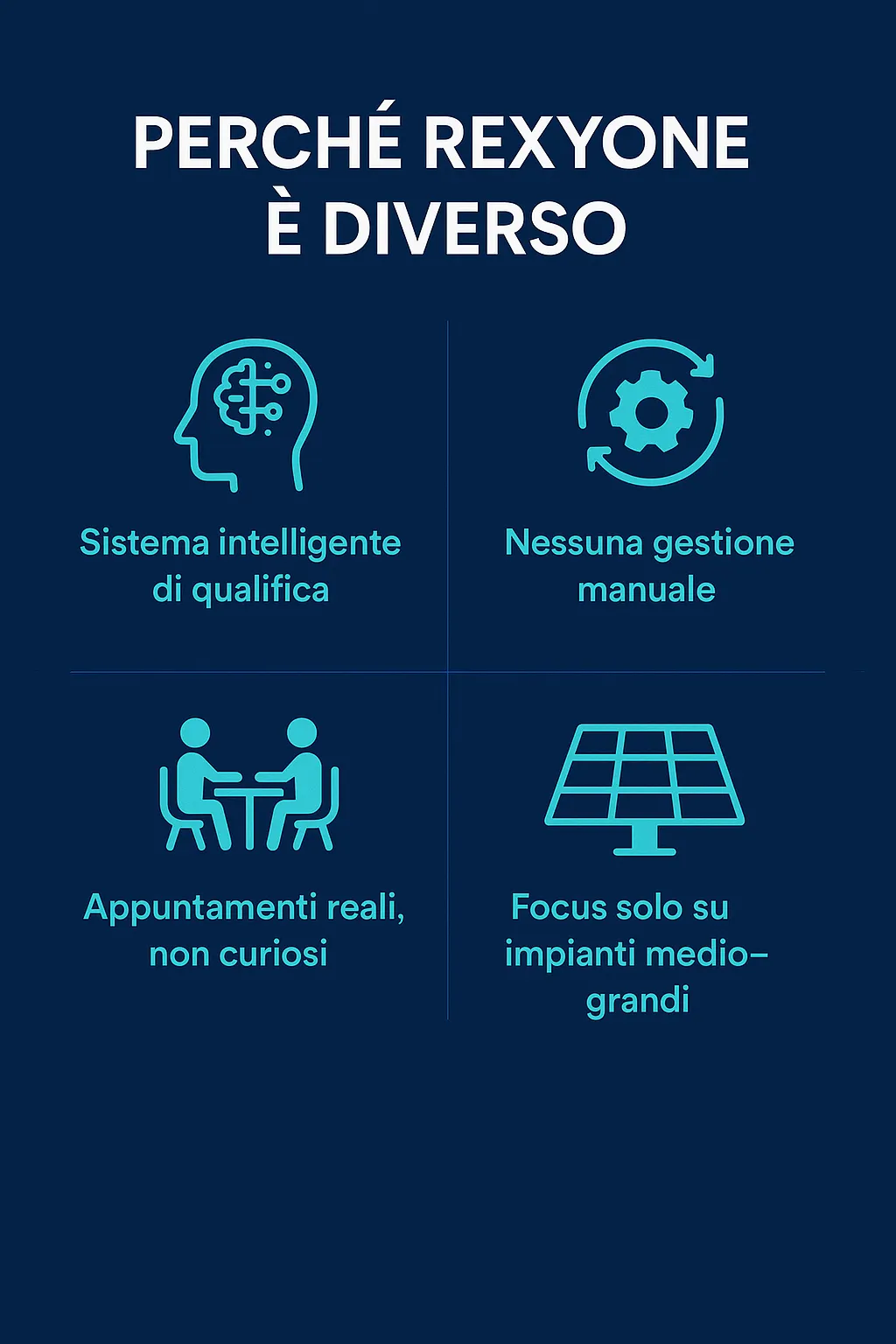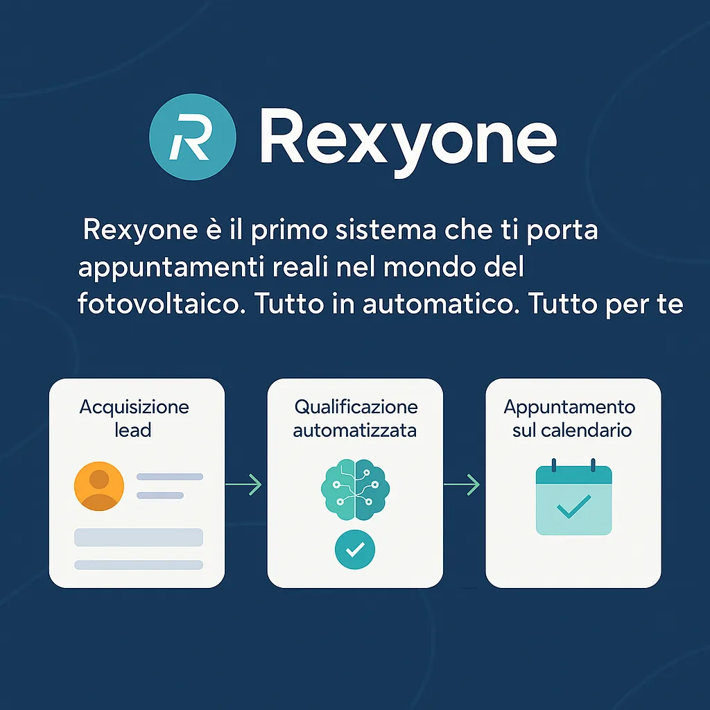 Rexyone è un servizio riservato ad aziende strutturate nel settore fotovoltaico non residenziale (agrifotovoltaico, industriale, MW) e offre un sistema automatizzato per la generazione e gestione di appuntamenti qualificati. L’accesso al sistema è limitato a un numero selezionato di aziende per area geografica.